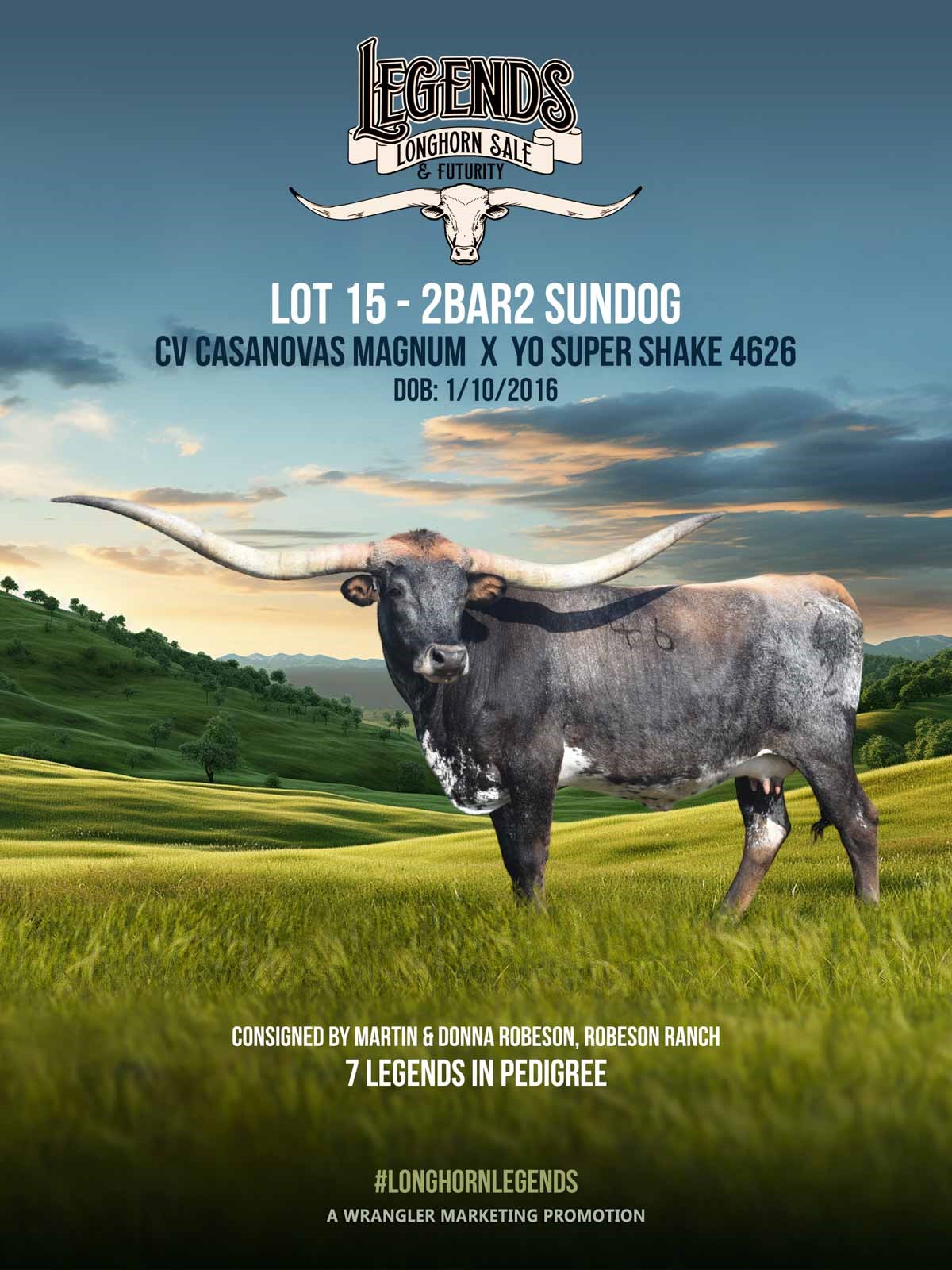 2BAR2 Sundog is the full package! We were excited to have purchased this cow out of the Legends sale in 2023. This cow has all the horn growth you could as for in one while keep a sound functional structure. Sundog has been wonderful producer giving us a bull calf out of WT Kid Rock in spring of 2024 and is confirmed bred to Justify for a spring 2025 calf.