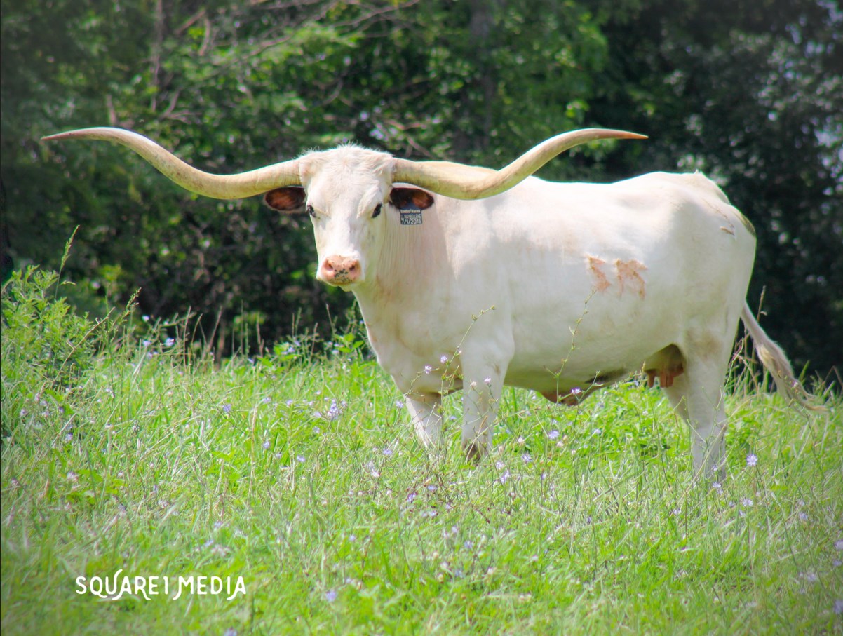 This gal has tons of lateral horn with a great twist. She is 84.5'' TTT and by the wow cow, Carmen BCB 123 who has over 118" of total horn. Maybellene is tall, feminine and very gentle. She has a gorgeous 2024 heifer by Drag Iron at side.