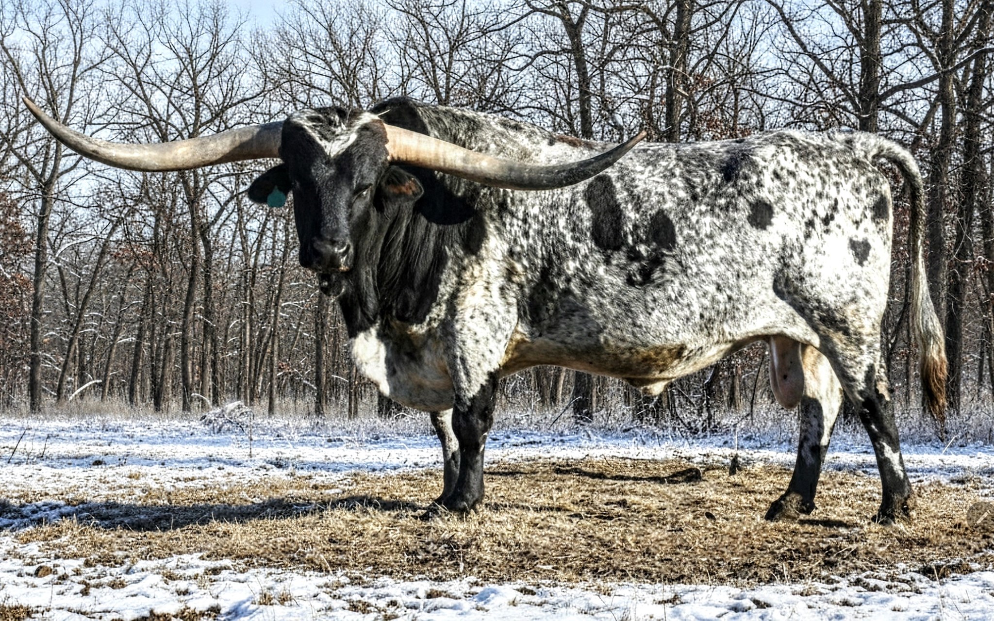 This bull has been in hiding but 2023 is a big year for him. He will be bred to some of the biggest horn young females in the breed. RJF Lock & Load is sired by the World Record holding longest horn bull Cowboy Tuff Chex 105.625" T2T and out of the World Record holding cow for total horn M Arrow Cha-Ching 103.75" T2T. Unmatched genetics that will take your program to the next level.